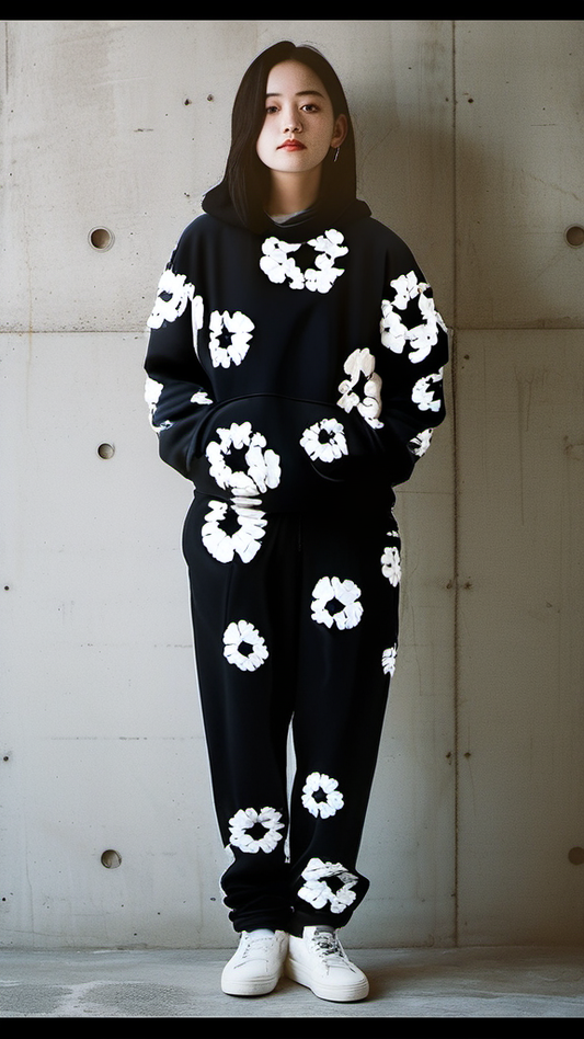 WOMEN FLOWER WORLD HOODIE OVERSIZED CO-ORD SET - BLACK AND BLACK