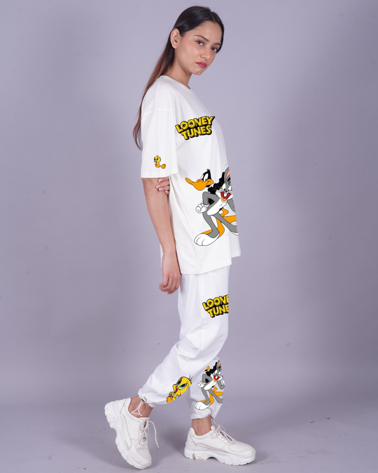 Women Looney Tunes Oversized Co-Ord Set - White and White