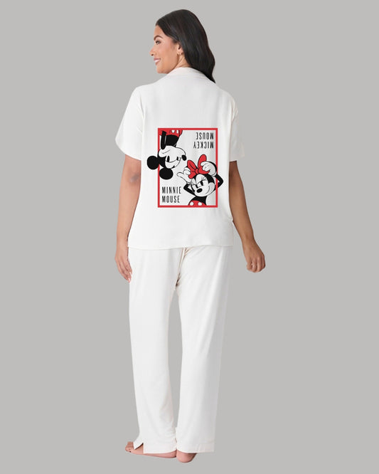 MOUSE FAMILY HALF SLEEVE OVERSIZED KNITTED SHIRT CORD SET - WHITE AND WHITE