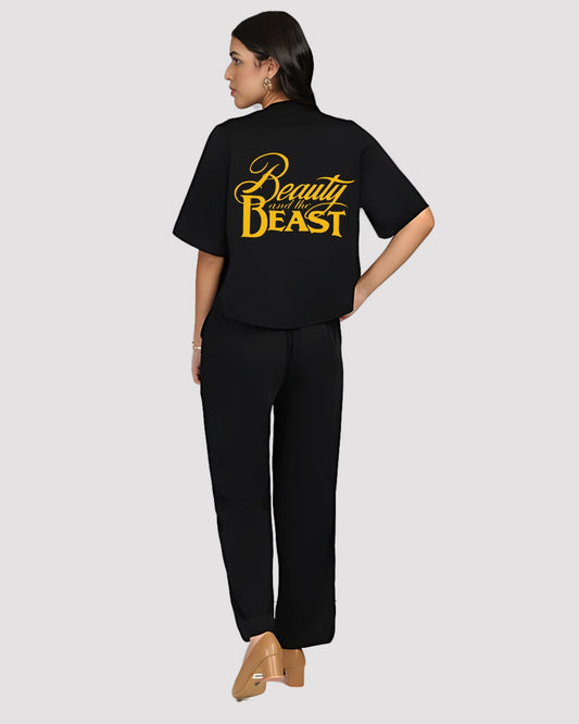 POWERPUFF WOMEN HALF SLEEVE OVERSIZED KNITTED SHIRT CORD SET - BLACK AND BLACK