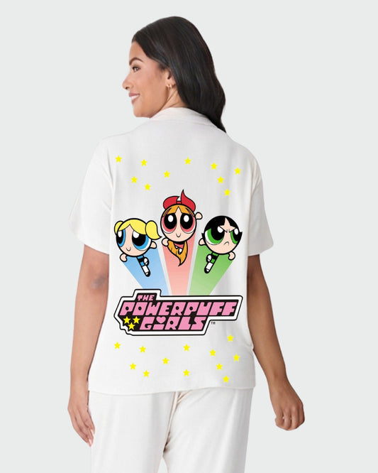 POWERPUFF HALF SLEEVE OVERSIZED KNITTED SHIRT CORD SET - WHITE AND WHITE