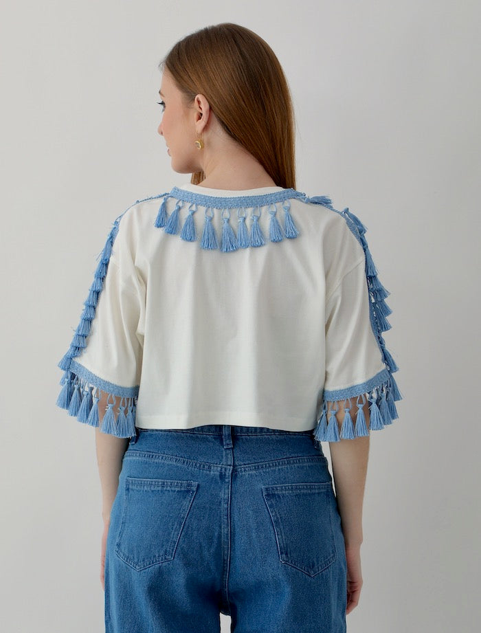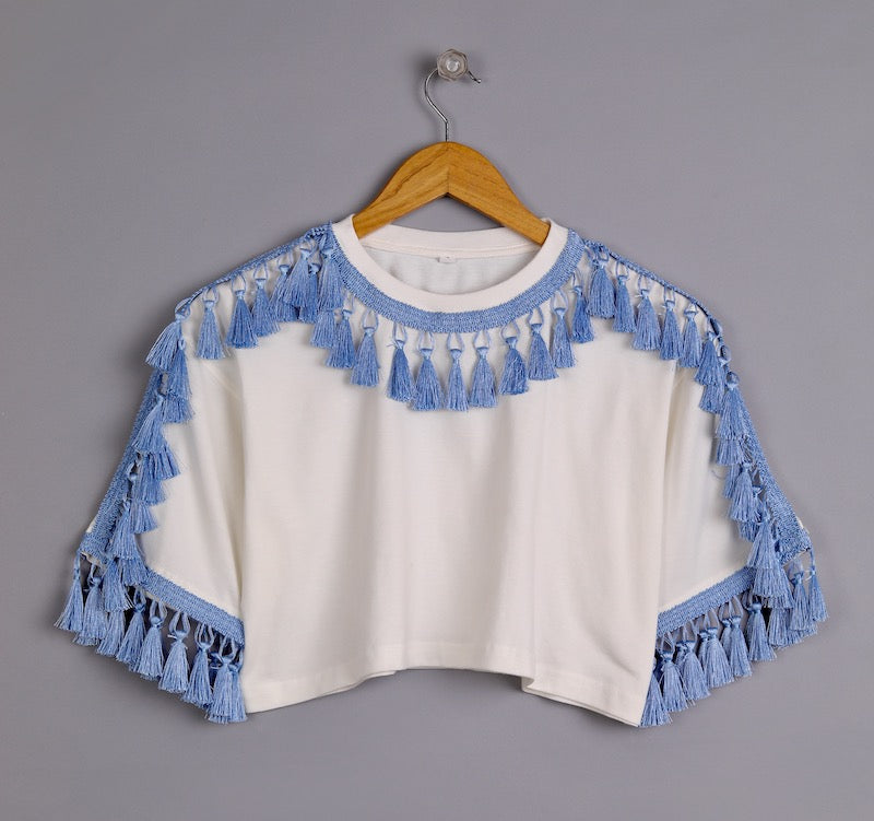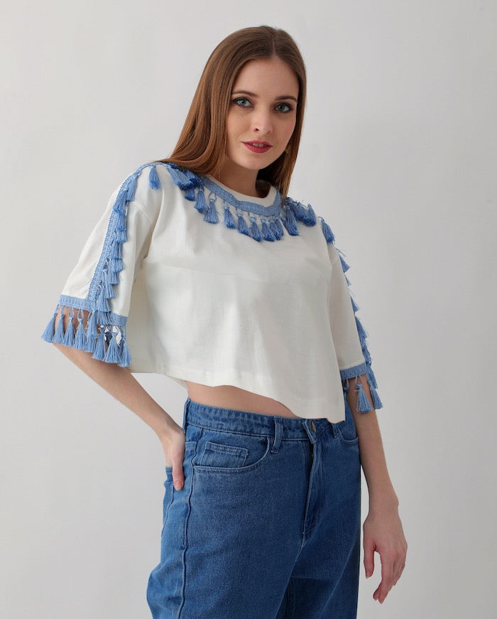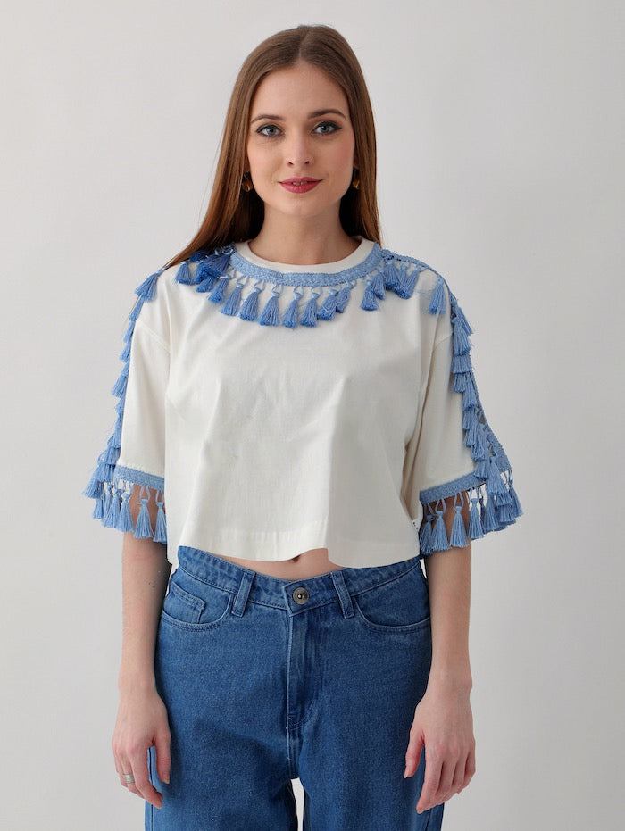 Women's Oversized Tops: Off-white with Blue Tassel Trim