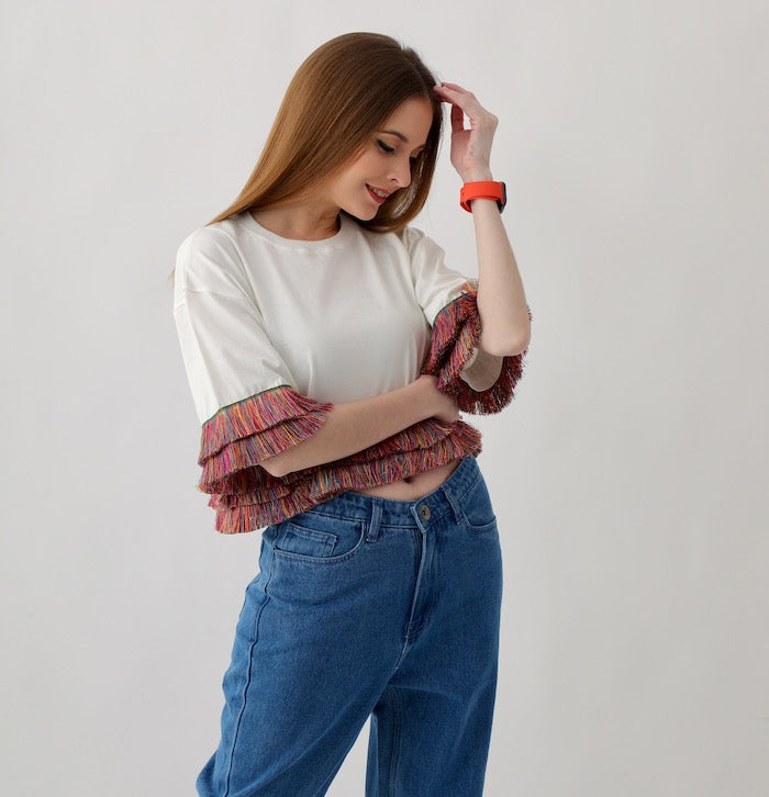 Designed with versatility in mind, our Tassel Trim Tops effortlessly complements various bottom styles. Pair it with high-waisted jeans for a trendy and relaxed daytime ensemble, or dress it up with a flowing maxi skirt for a boho-chic evening look. The trim top's neutral color palette allows for easy coordination with different accessories and complements a wide range of skin tones.