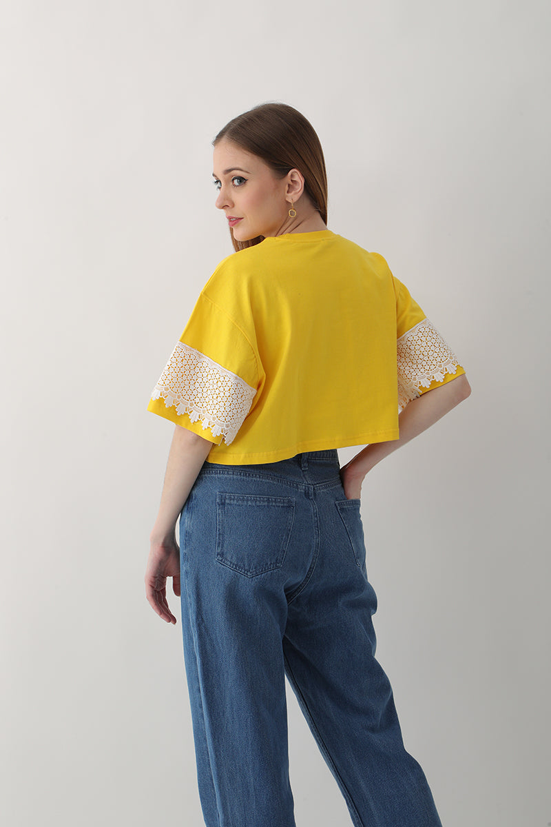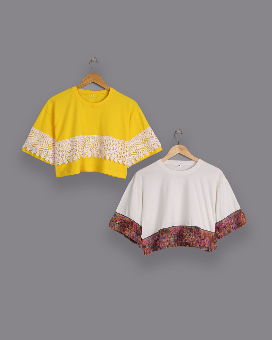 2 Women's Oversized Tops: Yellow Lace & Off-White Fringes, 100% Cotton