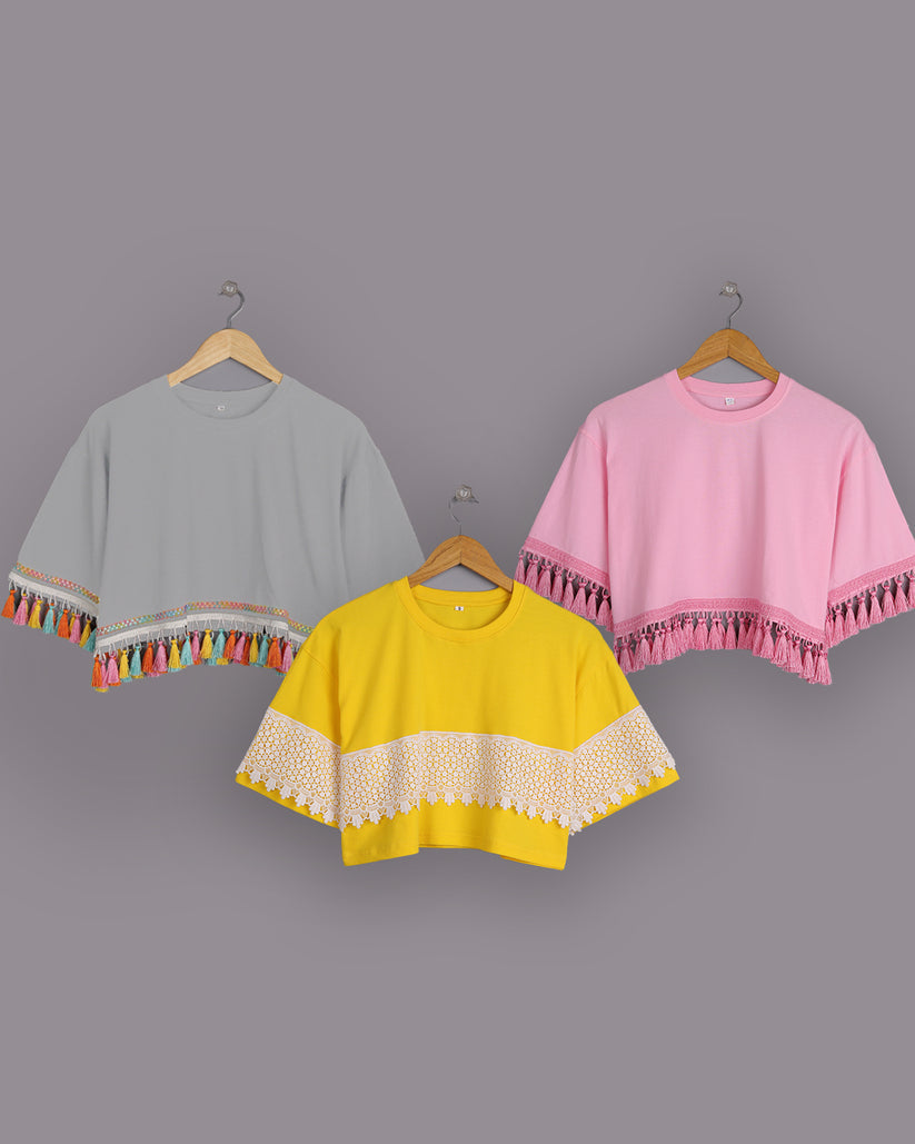 3-Pack Women's Oversized Tassel Tops: Fog Grey, Yellow & Pink, 100% Cotton