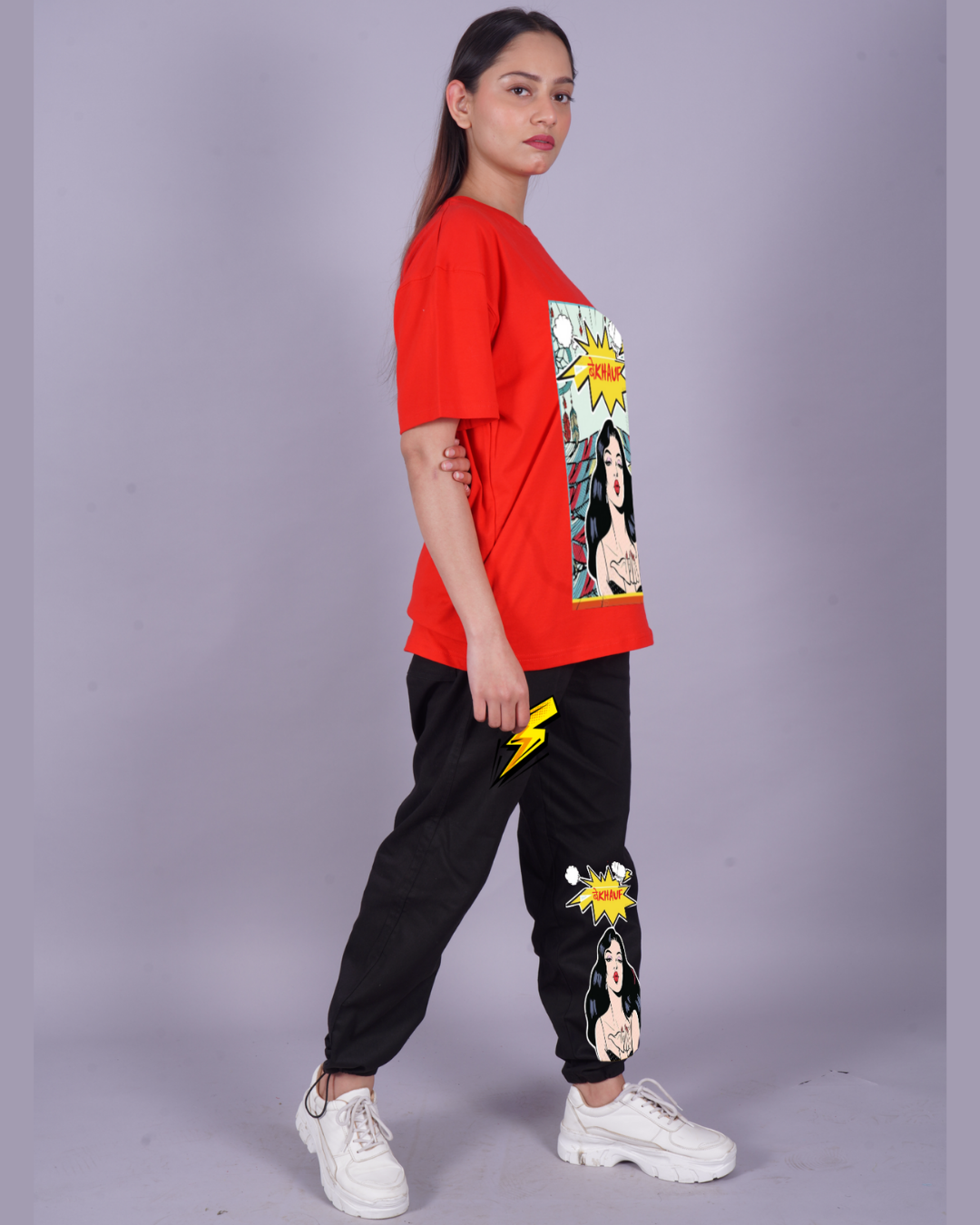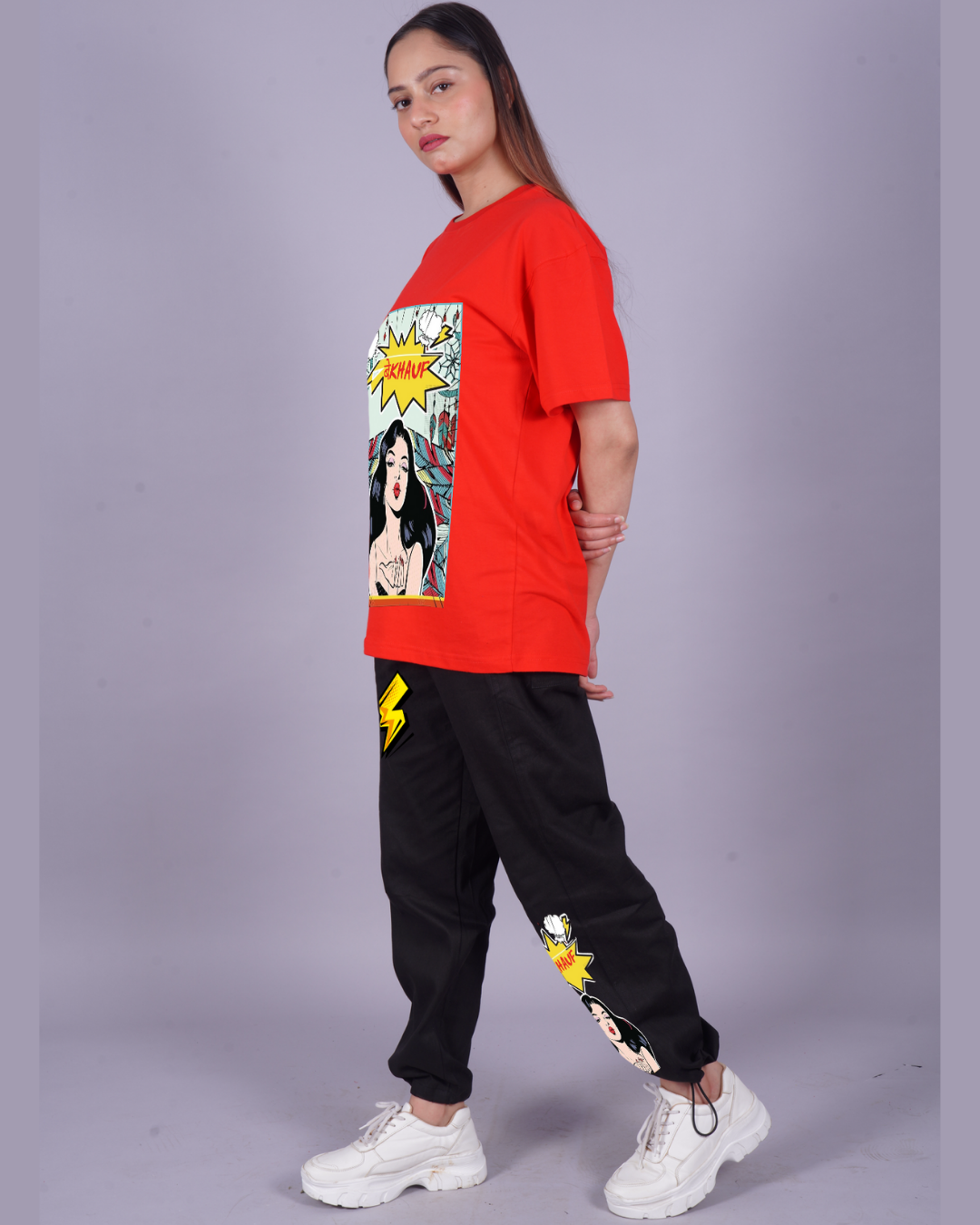 Women Bekhauf Graphic Oversized Co-Ord Set - Red and Black