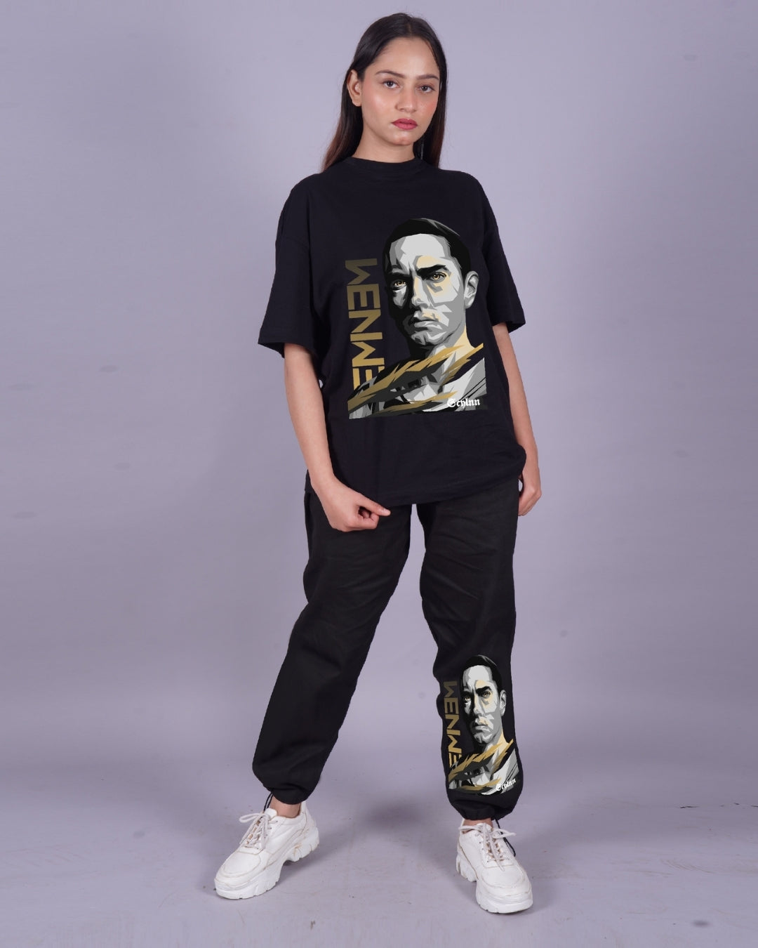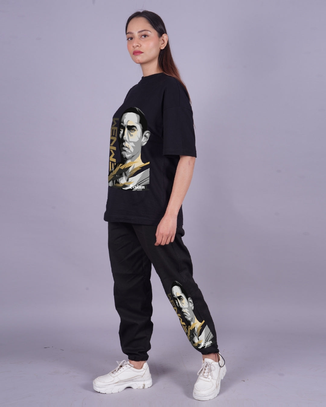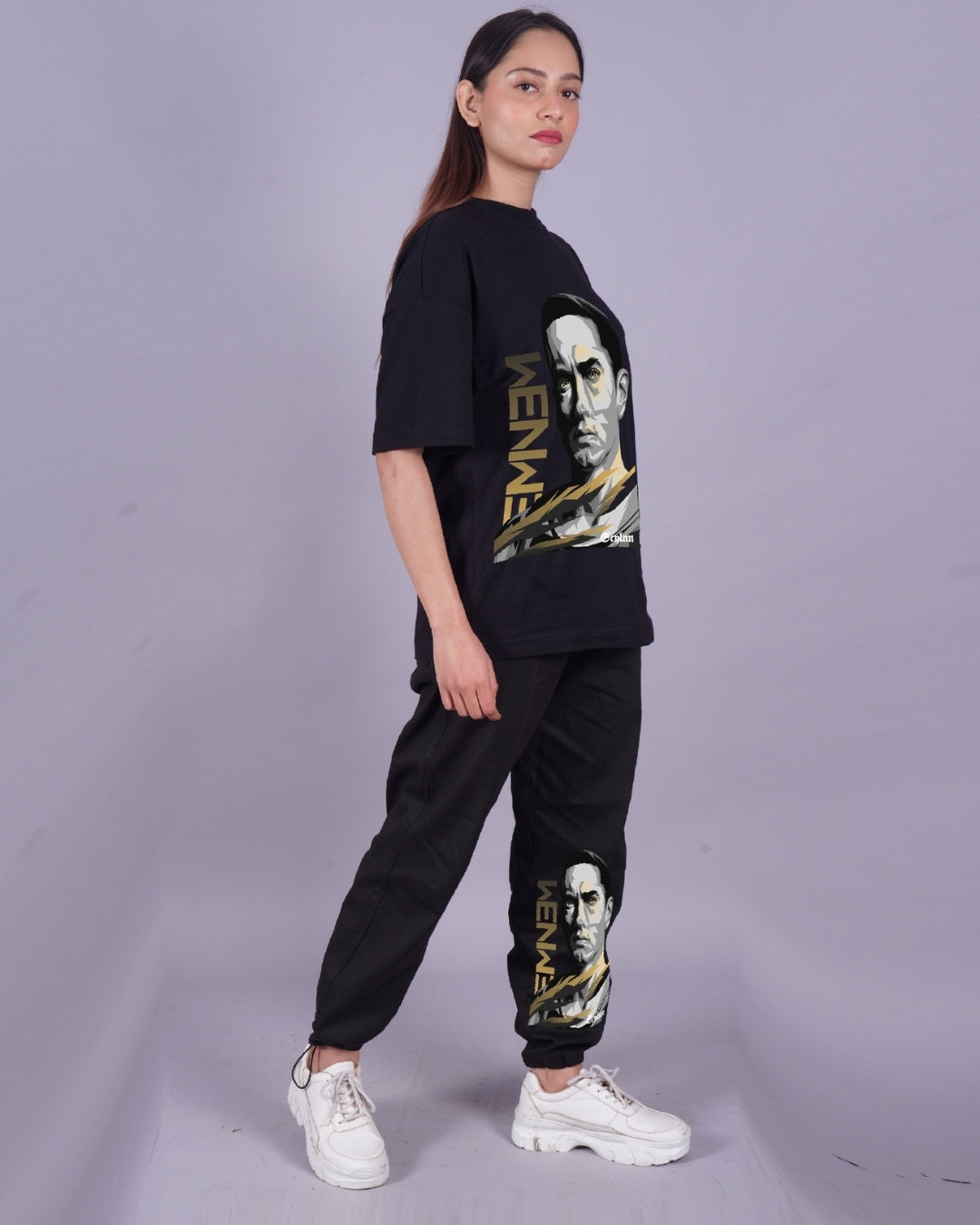 Women Eminem Graphic Oversized Co-Ord Set - Black and Black