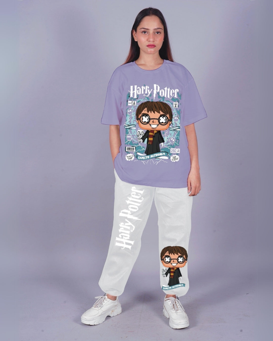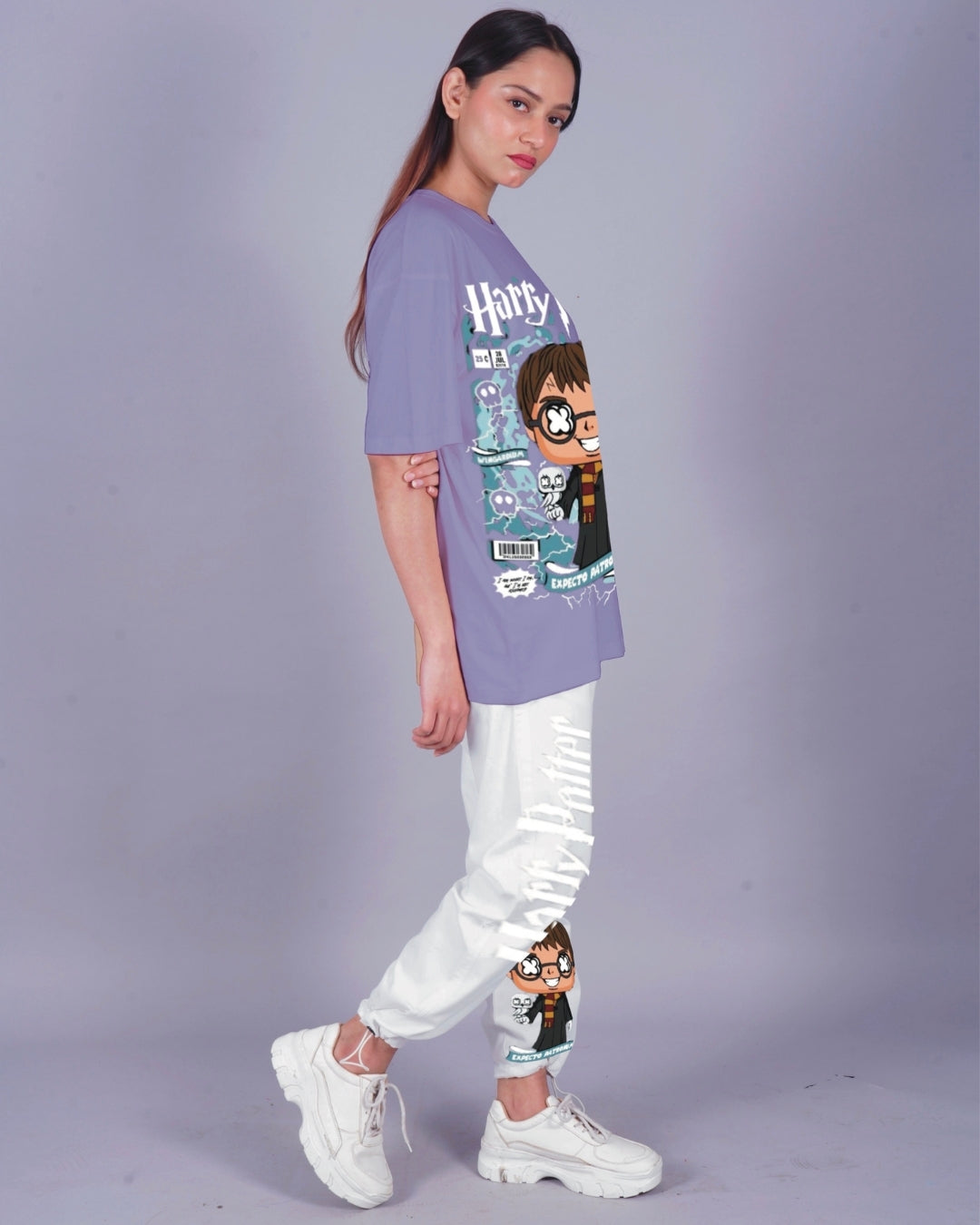Women Young Harry Porter Oversized Co-Ord Set - Purple and White